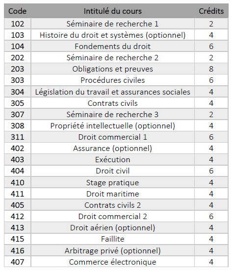 Le Département de droit privé est l’un des plus grands départements de la faculté en termes de nombre de cours et de corps professoral. Il comporte trois spécialisations principales :
