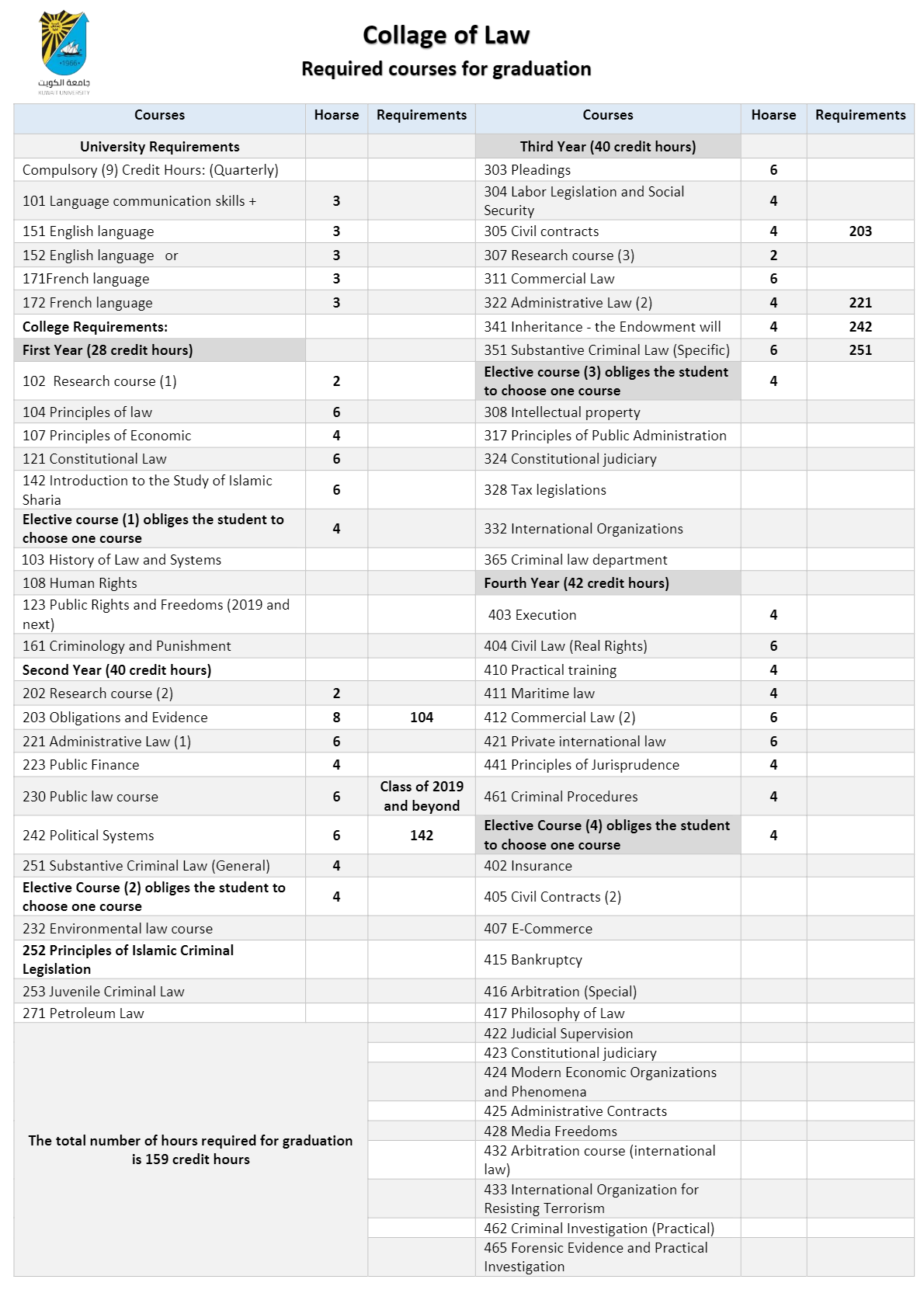 1. A student must graduate from the Faculty of Law to successfully pass all the courses required for graduation, totaling 159 hours, and obtain a general average of 70% (good) on the basis of the total scores obtained by the student in the four years.